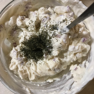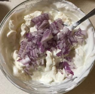 Once the greek yogurt and cream cheese are blended together well, I add in the lemon juice. It mixes in better without all the other ingredients in the way, and it also help finish the combining of the cheese and yogurt. I then add in the onion I chopped before hand and mix it in well. After that is mixed in, I add in the dill and a small pinch of salt. You don't want to add too much salt at this point because the salmon will add some. But a small pinch will help the flavors really shine.